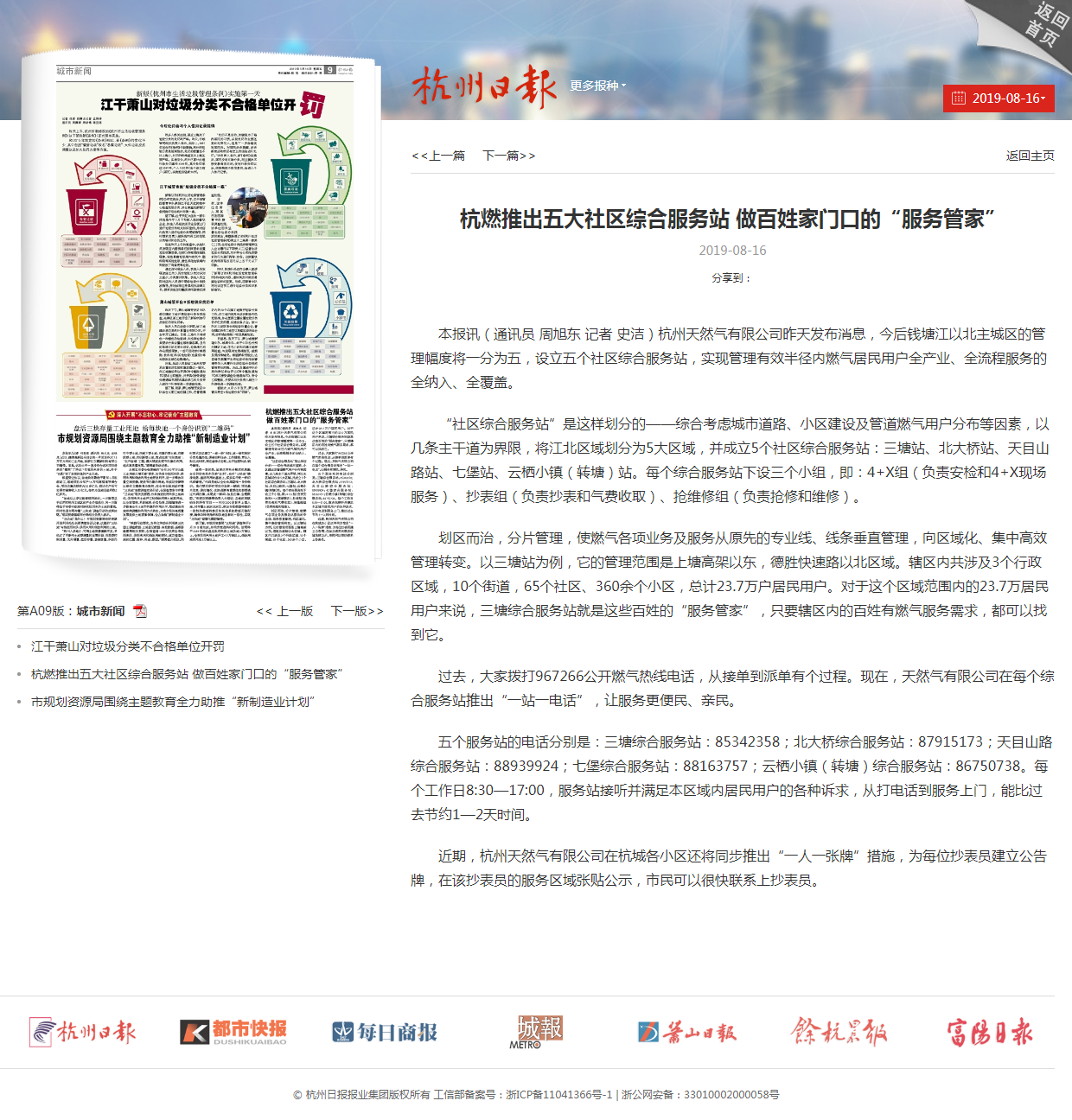 五個(gè)服務(wù)站的電話分別是:三塘綜合服務(wù)站:85342358;北大橋綜合服務(wù)站:87915173;天目山路綜合服務(wù)站:88939924;七堡綜合服務(wù)站:88163757;云棲小鎮(zhèn)(轉(zhuǎn)塘)綜合服務(wù)站:86750738。每個(gè)工作日8:30—17:00,服務(wù)站接聽并滿足本區(qū)域內(nèi)居民用戶的各種訴求,從打電話到服務(wù)上門,能比過去節(jié)約1—2天時(shí)間。
