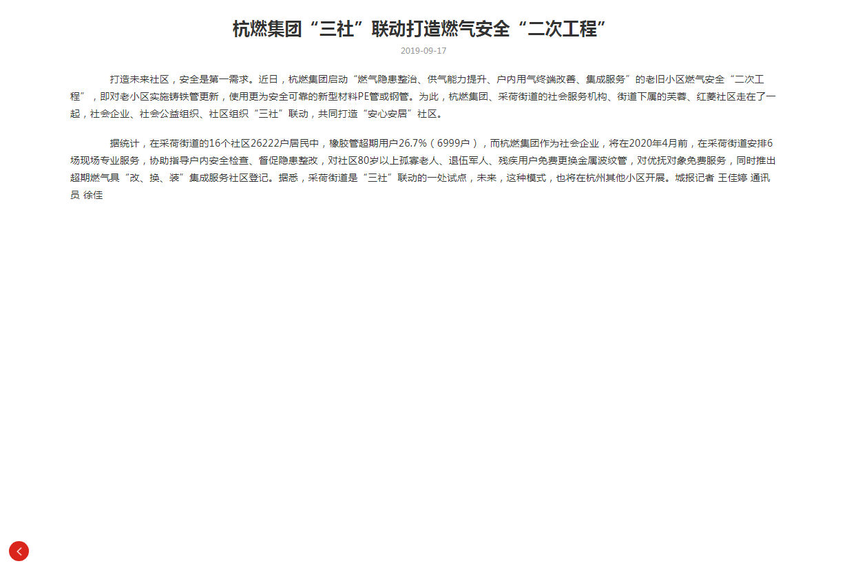 打造未來社區(qū),安全是第一需求。近日,杭燃集團(tuán)啟動(dòng)“燃?xì)怆[患整治、供氣能力提升、戶內(nèi)用氣終端改善、集成服務(wù)”的老舊小區(qū)燃?xì)獍踩岸喂こ獭,即?duì)老小區(qū)實(shí)施鑄鐵管更新,使用更為安全可靠的新型材料PE管或鋼管。為此,杭燃集團(tuán)、采荷街道的社會(huì)服務(wù)機(jī)構(gòu)、街道下屬的芙蓉、紅菱社區(qū)走在了一起,社會(huì)企業(yè)、社會(huì)公益組織、社區(qū)組織“三社”聯(lián)動(dòng),共同打造“安心安居”社區(qū)。