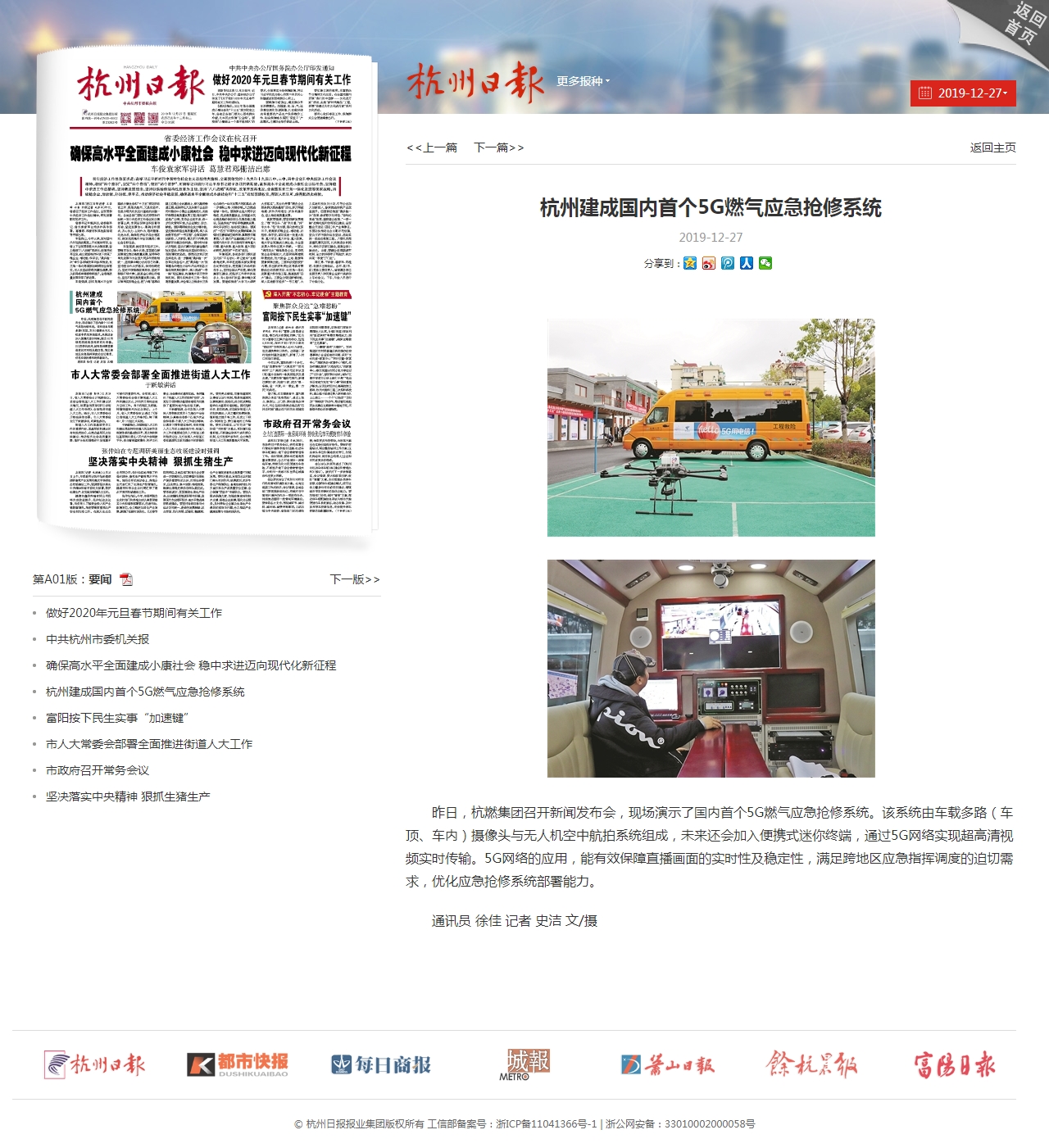 昨日,杭燃集團(tuán)召開(kāi)新聞發(fā)布會(huì),現(xiàn)場(chǎng)演示了國(guó)內(nèi)首個(gè)5G燃?xì)鈶?yīng)急搶修系統(tǒng)。該系統(tǒng)由車載多路(車頂、車內(nèi))攝像頭與無(wú)人機(jī)空中航拍系統(tǒng)組成,未來(lái)還會(huì)加入便攜式迷你終端,通過(guò)5G網(wǎng)絡(luò)實(shí)現(xiàn)超高清視頻實(shí)時(shí)傳輸。5G網(wǎng)絡(luò)的應(yīng)用,能有效保障直播畫面的實(shí)時(shí)性及穩(wěn)定性,滿足跨地區(qū)應(yīng)急指揮調(diào)度的迫切需求,優(yōu)化應(yīng)急搶修系統(tǒng)部署能力。