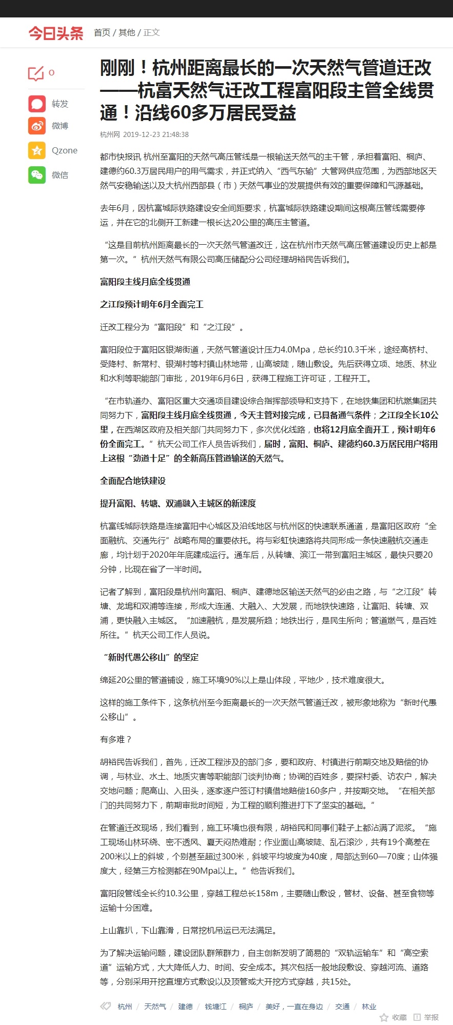 都市快報訊 杭州至富陽的天然氣高壓管線是一根輸送天然氣的主干管,承擔(dān)著富陽、桐廬、建德約60.3萬居民用戶的用氣需求,并正式納入“西氣東輸”大管網(wǎng)供應(yīng)范圍,為西部地區(qū)天然氣安穩(wěn)輸送以及大杭州西部縣(市)天然氣事業(yè)的發(fā)展提供有效的重要保障和氣源基礎(chǔ)。