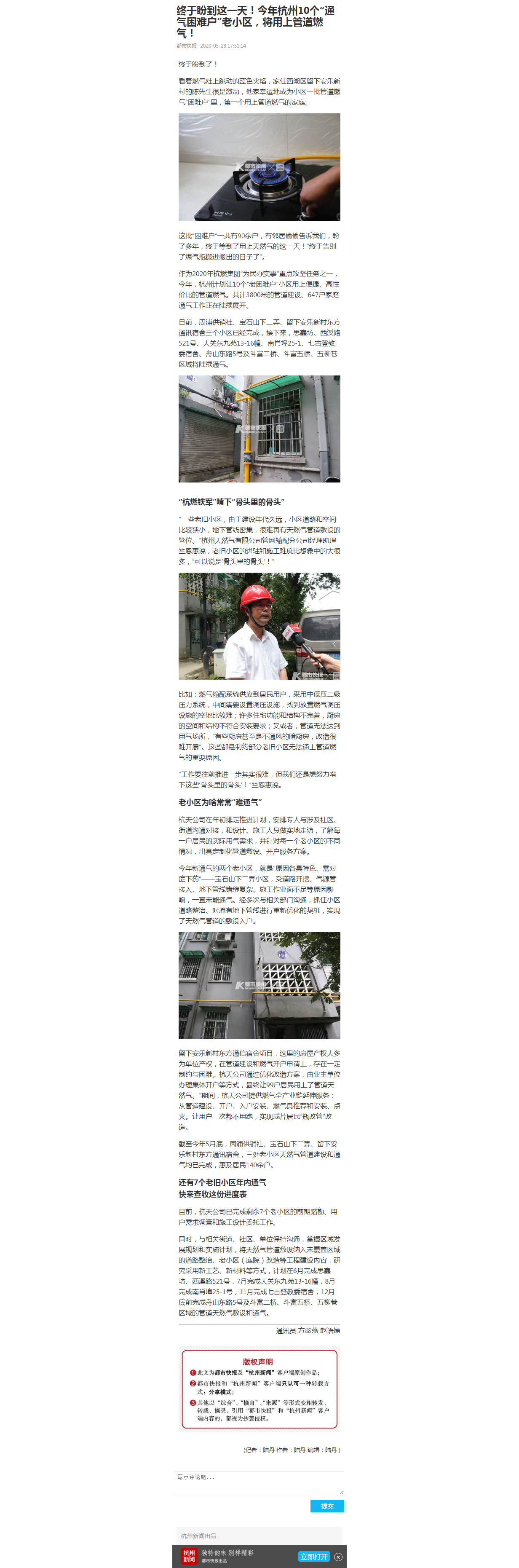 作為2020年杭燃集團“為民辦實事”重點攻堅任務(wù)之一,今年,杭州計劃讓10個“老困難戶”小區(qū)用上便捷、高性價比的管道燃氣。共計3800米的管道建設(shè)、647戶家庭通氣工作正在陸續(xù)展開。