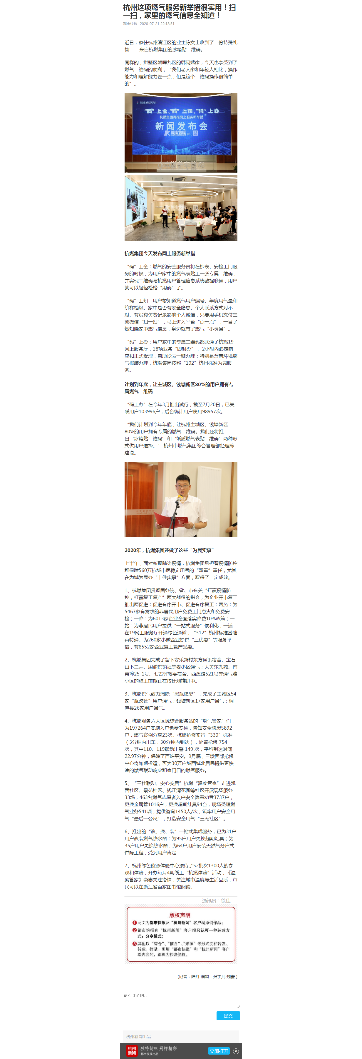 7、杭州綠色能源體驗(yàn)中心接待了52批次1300人的參觀和體驗(yàn),開辦每月4期線上“杭燃體驗(yàn)”活動(dòng);《溫度管家》雜志關(guān)注疫情,關(guān)注城市溫度與生活品質(zhì),市民可以在浙江省百家圖書館閱讀。