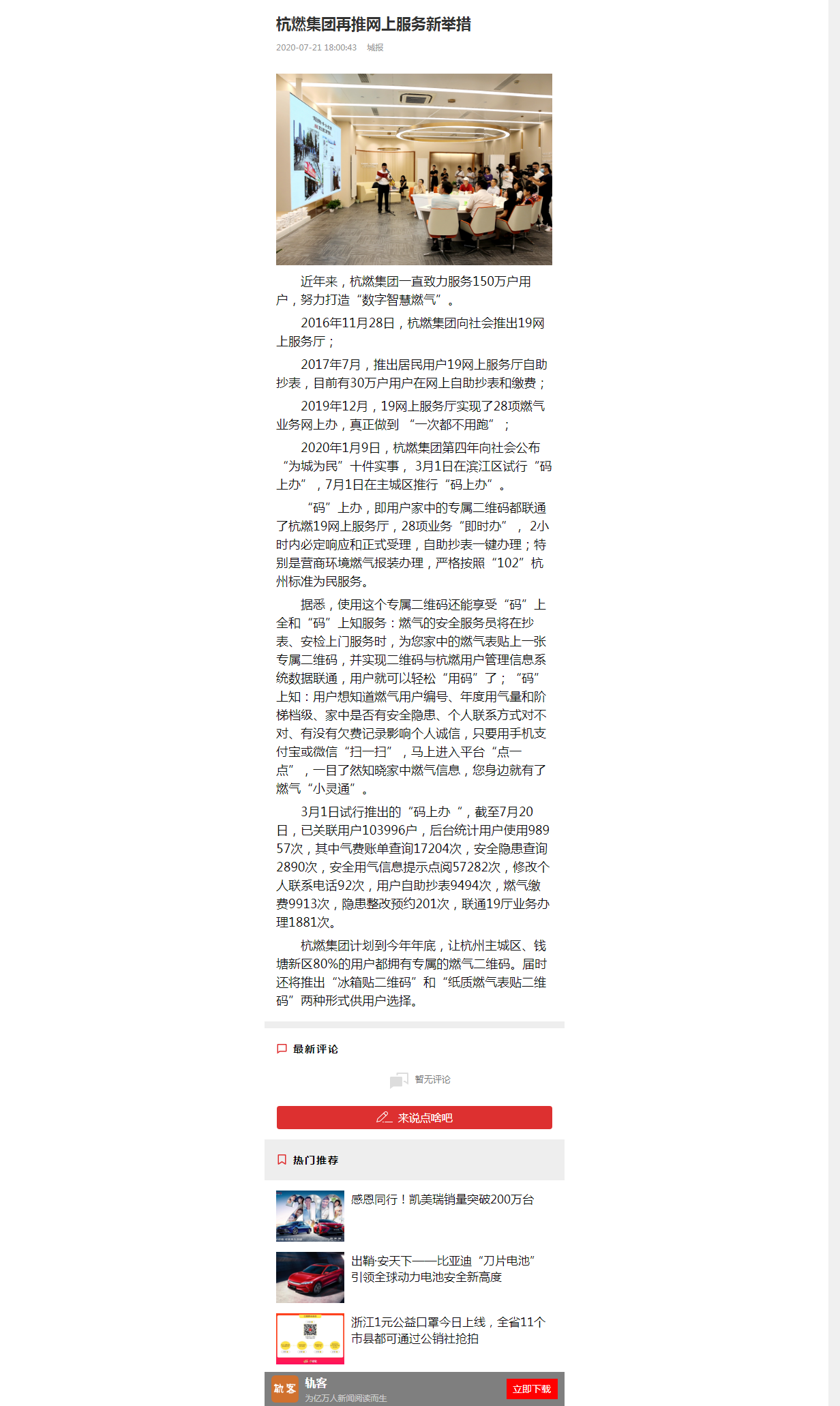 2020年1月9日,杭燃集團(tuán)第四年向社會公布“為城為民”十件實(shí)事, 3月1日在濱江區(qū)試行“碼上辦”,7月1日在主城區(qū)推行“碼上辦”。