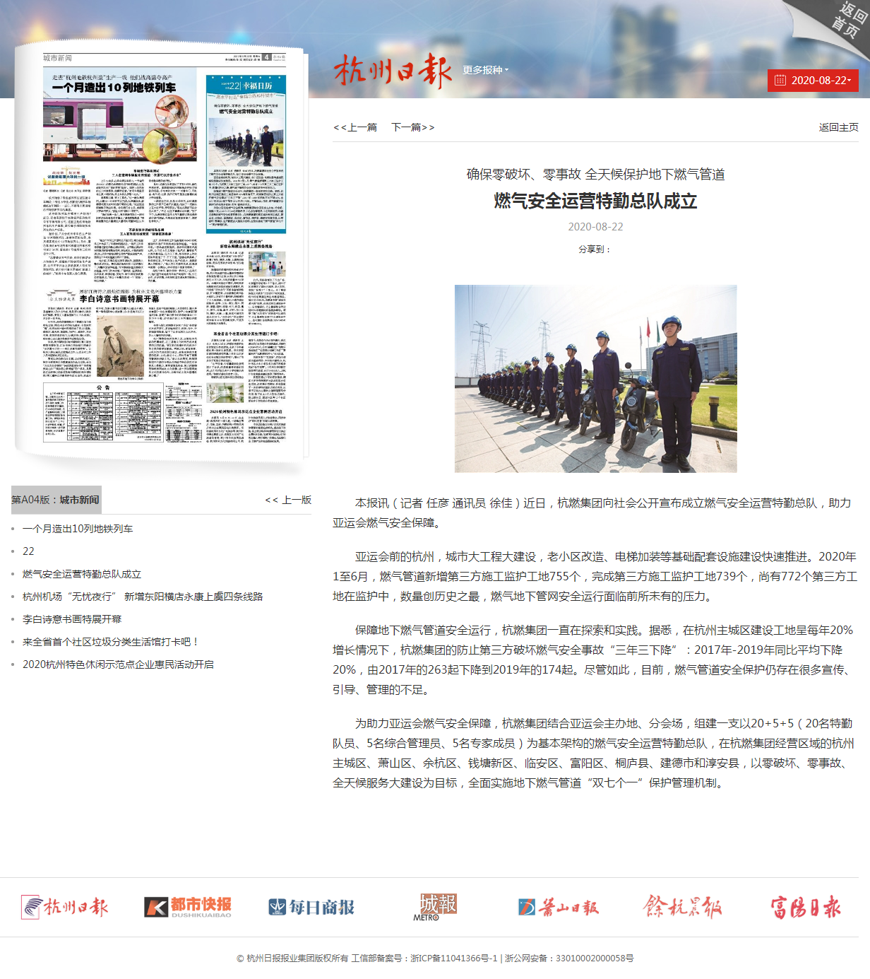 為助力亞運(yùn)會(huì)燃?xì)獍踩U,杭燃集團(tuán)結(jié)合亞運(yùn)會(huì)主辦地、分會(huì)場(chǎng),組建一支以20+5+5(20名特勤隊(duì)員、5名綜合管理員、5名專家成員)為基本架構(gòu)的燃?xì)獍踩\(yùn)營(yíng)特勤總隊(duì),在杭燃集團(tuán)經(jīng)營(yíng)區(qū)域的杭州主城區(qū)、蕭山區(qū)、余杭區(qū)、錢塘新區(qū)、臨安區(qū)、富陽區(qū)、桐廬縣、建德市和淳安縣,以零破壞、零事故、全天候服務(wù)大建設(shè)為目標(biāo),全面實(shí)施地下燃?xì)夤艿馈半p七個(gè)一”保護(hù)管理機(jī)制。