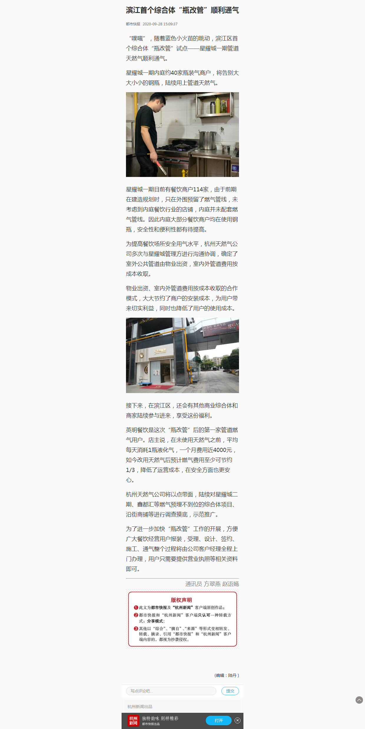 為提高餐飲場(chǎng)所安全用氣水平,杭州天然氣公司多次與星耀城管理方進(jìn)行溝通協(xié)調(diào),確定了室外公共管道由物業(yè)出資,室內(nèi)外管道費(fèi)用按成本收取。