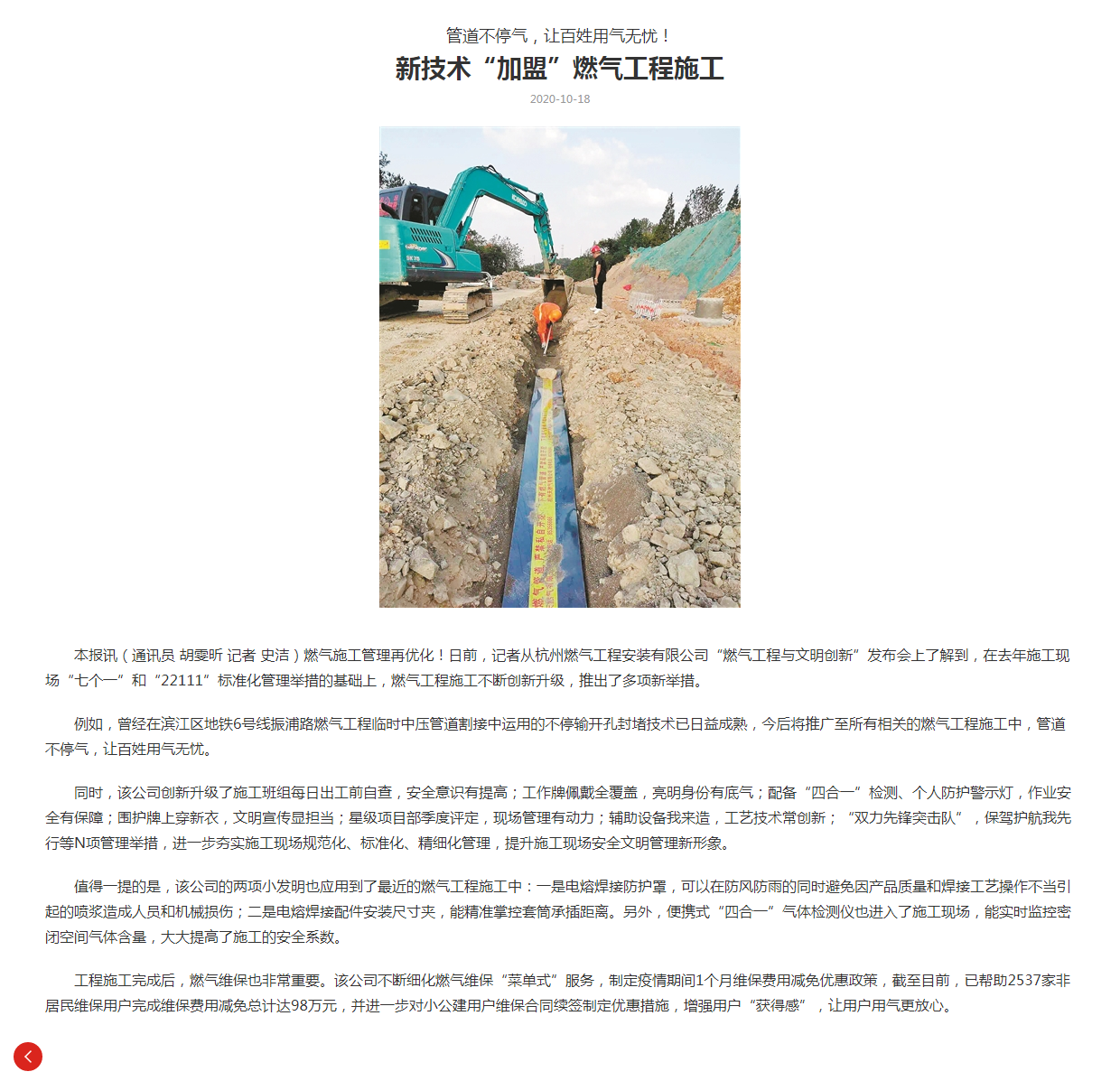 燃?xì)馐┕す芾碓賰?yōu)化!日前,記者從杭州燃?xì)夤こ贪惭b有限公司“燃?xì)夤こ膛c文明創(chuàng)新”發(fā)布會(huì)上了解到,在去年施工現(xiàn)場(chǎng)“七個(gè)一”和“22111”標(biāo)準(zhǔn)化管理舉措的基礎(chǔ)上,燃?xì)夤こ淌┕げ粩鄤?chuàng)新升級(jí),推出了多項(xiàng)新舉措。